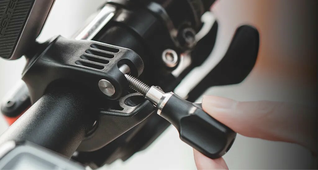 Переходная часть крепления имеет две точки вращения, можно выбрать любой угол и надёжно зафиксировать его с помощью фиксирующего колеса. Зажим адаптируется под широкий диапазон диаметров.